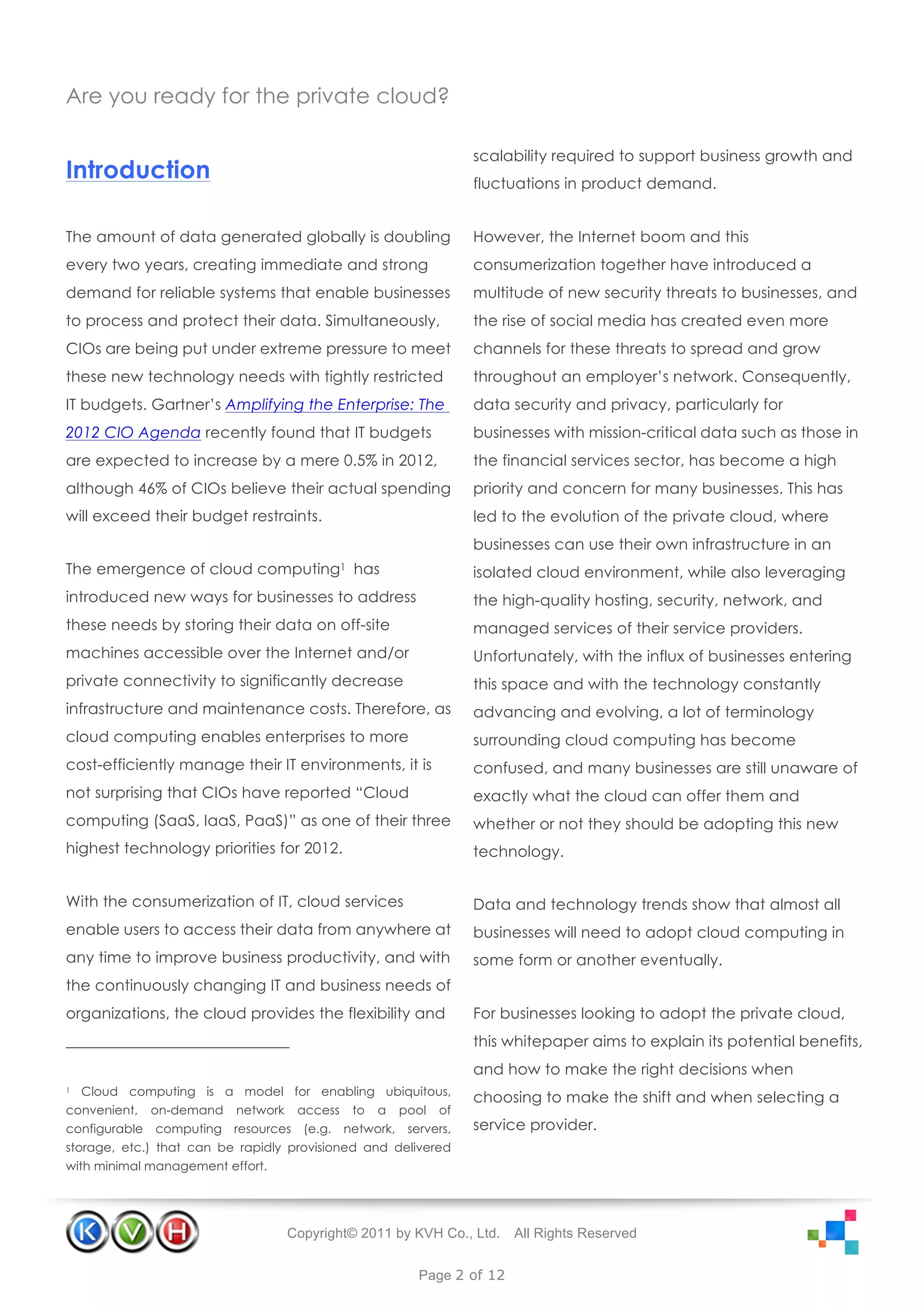 The white paper discusses the importance of private cloud services for businesses, emphasizing their potential benefits such as enhanced security, flexibility, and scalability. It outlines a decision-making process for companies considering the shift to private cloud, including assessing organizational readiness and selecting the right service provider. Additionally, it highlights key considerations such as compliance, performance goals, and the need for customized solutions based on specific business requirements.