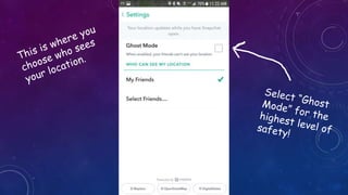 The document highlights the safety concerns associated with Snapchat's new map feature, which allows users to see each other's locations. It warns that even in 'ghost mode,' friends can access a user's exact location, creating potential risks in vulnerable situations. It emphasizes awareness and caution while using the app to protect personal safety.