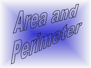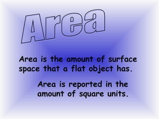 The document defines and provides examples of area and perimeter. It explains that area is measured in square units and represents the amount of surface space an object has. Perimeter is the distance around the outside edge of a flat object and is measured in linear units. Examples are given of calculating the area of shapes by counting squares and the perimeter by counting sides. The document concludes by comparing the area and perimeter of two sample swimming pools.
