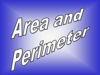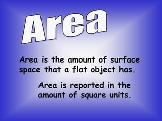 The document defines area and perimeter. Area is the amount of surface space measured in square units. Perimeter is the distance around the outside edge of a flat object, measured in linear units. Examples are provided to calculate the area and perimeter of different shapes by counting squares and sides. The document then provides an example comparing the area and perimeter of two neighbors' swimming pools to determine which family has the larger pool area and which has more side panels to clean.
