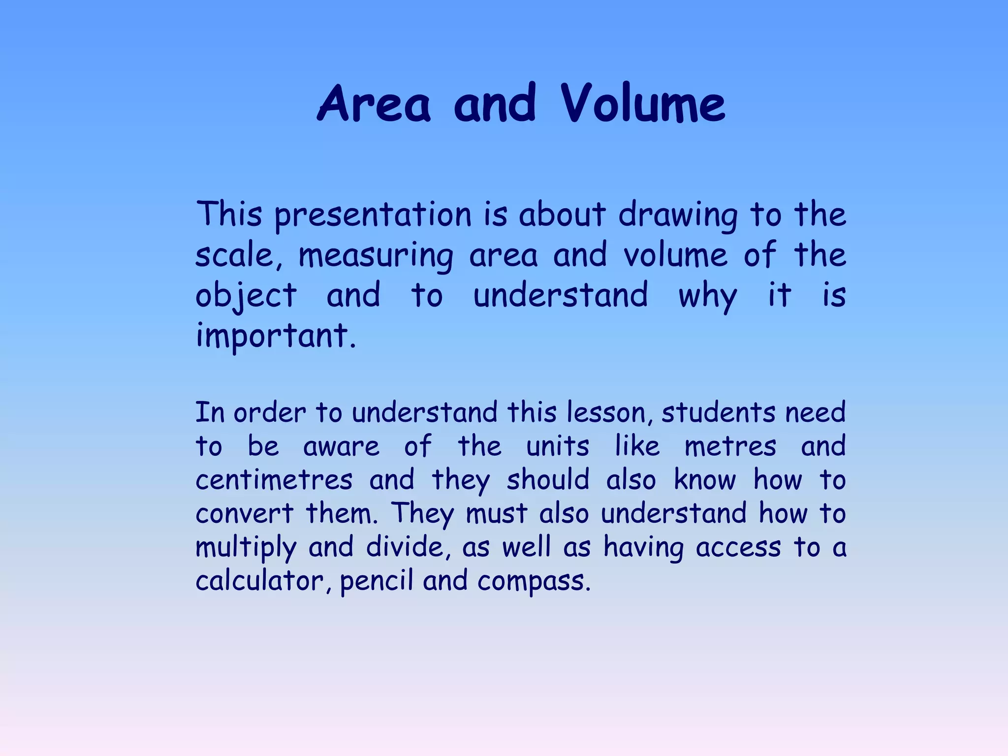 This presentation discusses calculating the area and volume of objects by understanding basic units of measurement, how to measure the area of different shapes like triangles and circles, and how to calculate the volume of cubes, cylinders and other objects by multiplying measurements of length, width, and height or radius. Examples are provided for calculating materials needed for projects like covering roofs based on area and how much paint or water a container can hold based on volume.