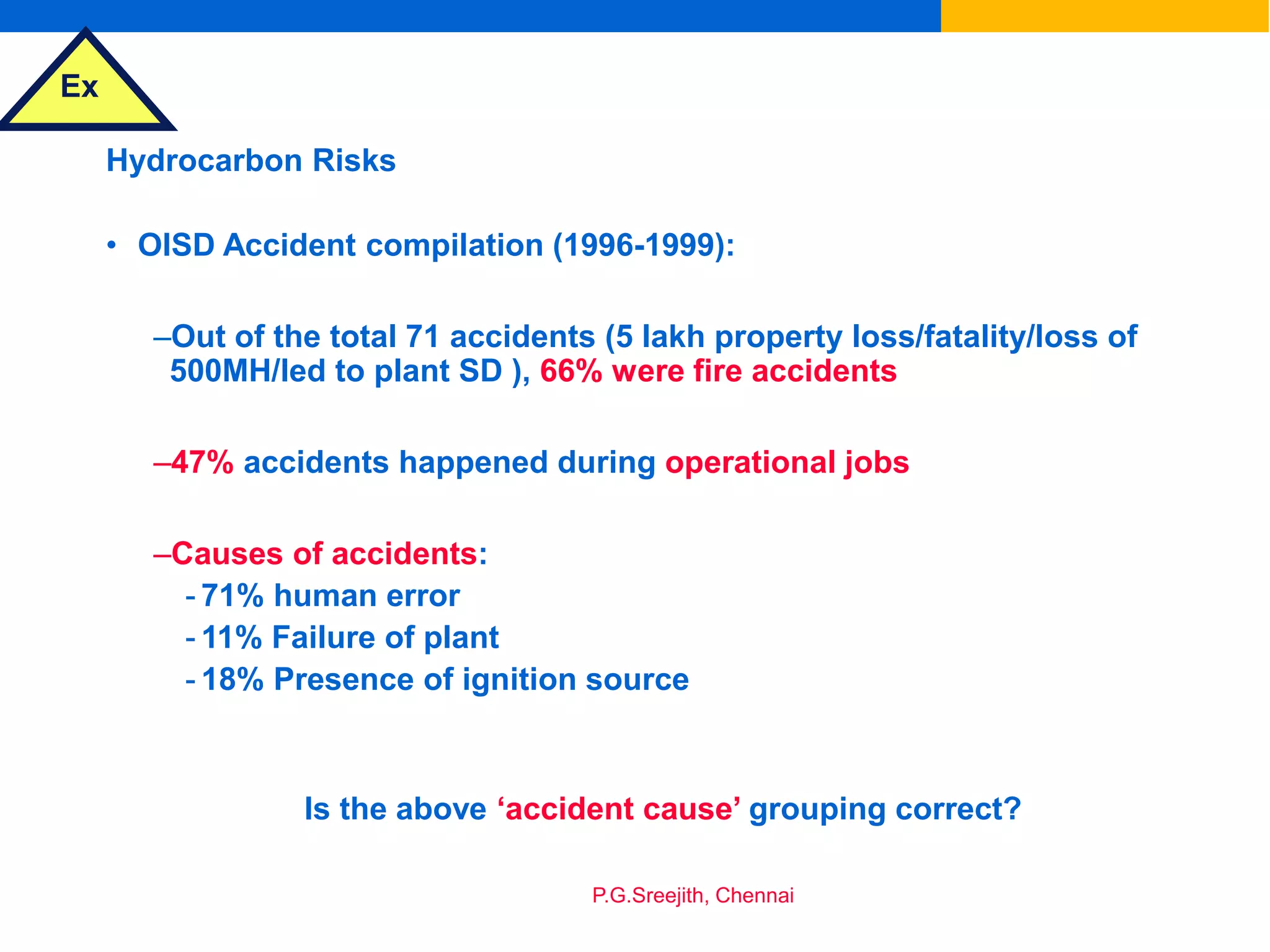 This document discusses hazardous area classification and selection of electrical equipment for flammable atmospheres. It provides definitions of hazardous areas according to Indian standards and discusses the classification of areas into zones based on the frequency and duration of explosive gas atmospheres. The document summarizes guidelines for classifying areas, including considering gas density, air currents, and leak scenarios. An experienced process engineer's judgement in visualizing leak scenarios and classifying hazardous areas is identified as the most crucial factor. The document proposes extending the area classification procedure to additionally assess ignition sources and apply a risk assessment matrix to potentially reduce zone areas and relax zone designations.