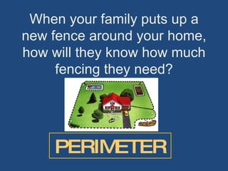 The document discusses perimeter and area, defining perimeter as the distance all the way around a figure and area as the number of square units needed to cover a surface. It provides formulas for calculating the perimeter and area of squares and rectangles. The perimeter of a square is calculated as P = 4s and the area as A = s^2. For a rectangle, the perimeter formula is P = 2w + 2l and the area formula is A = lw.