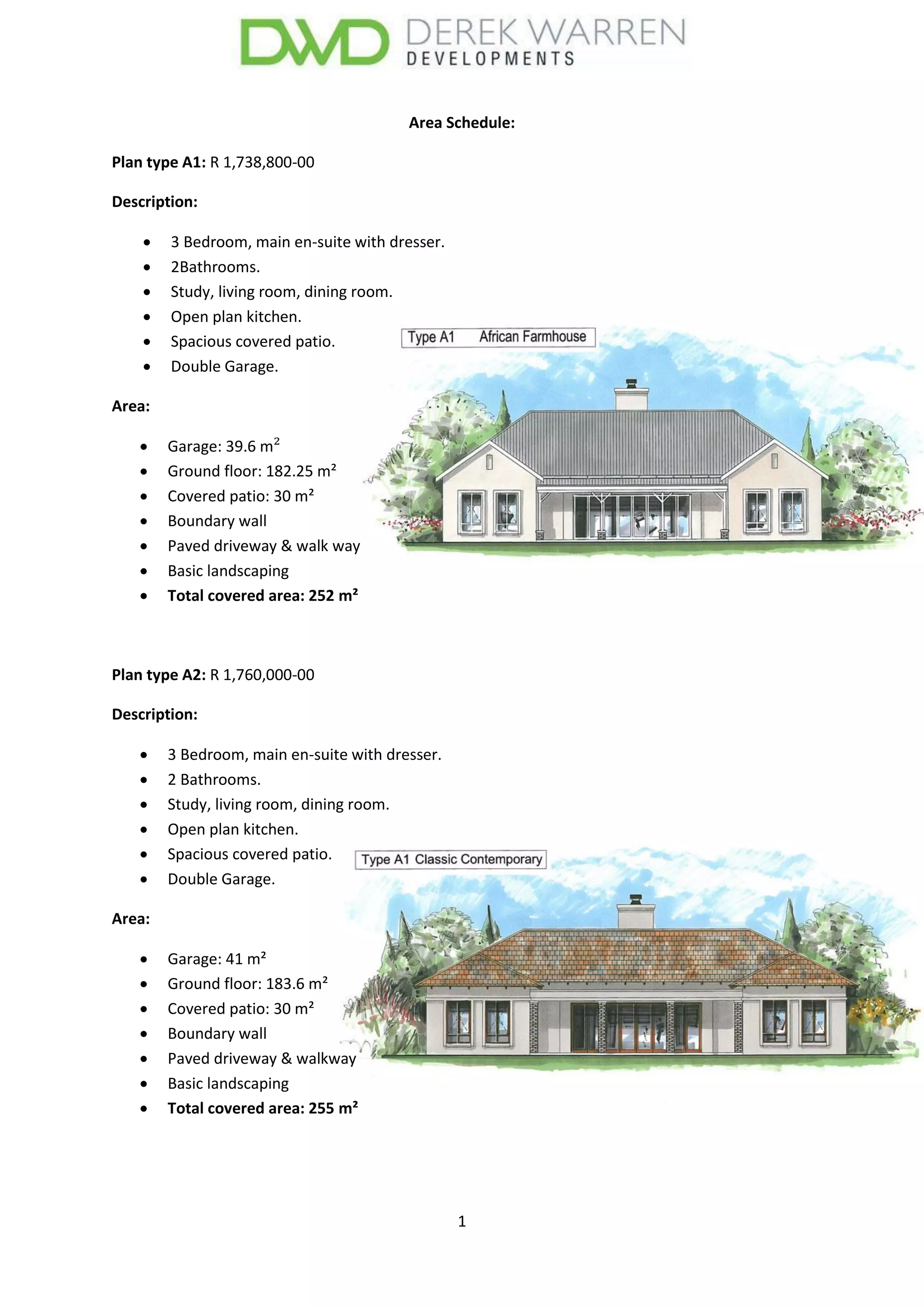 The document provides details on various residential property development plans, including floor plans, sizes, features, and prices. Plan types range from A1 to WAR and include details on number of bedrooms, bathrooms, living areas, outdoor spaces, and total covered area which ranges from around 250 square meters to 430 square meters. Prices listed for the plan types range from around R1.7 million to R2.5 million. The document is from Derek Warren Developments, a company that specializes in building custom and turnkey homes.
