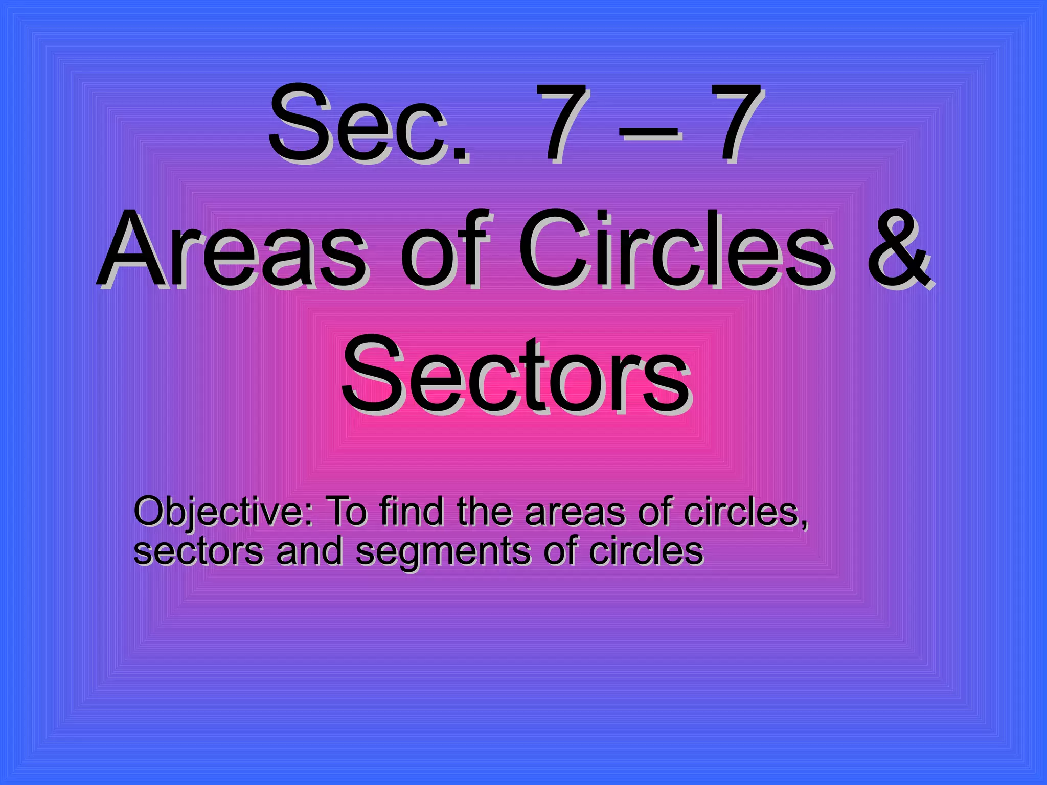 The document discusses calculating the areas of circles, sectors, and segments of circles. It defines a circle as having the area of πr^2, a sector as a fractional part of the total circle area defined by an arc and its radii, and a segment as the portion of a sector minus the area of the triangle formed by the arc and its radii. It provides examples of calculating the areas of full circles, sectors of varying central angles, and segments.