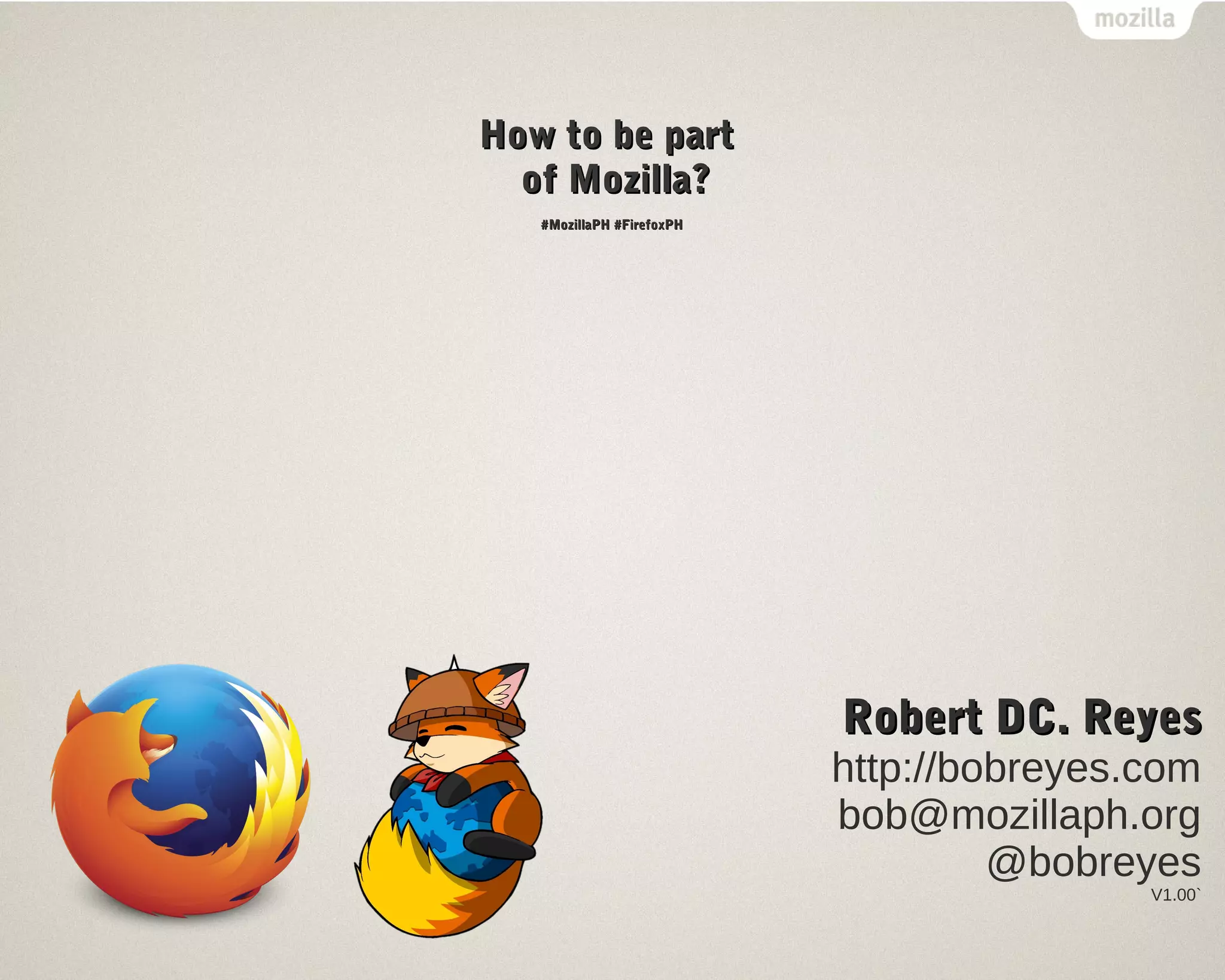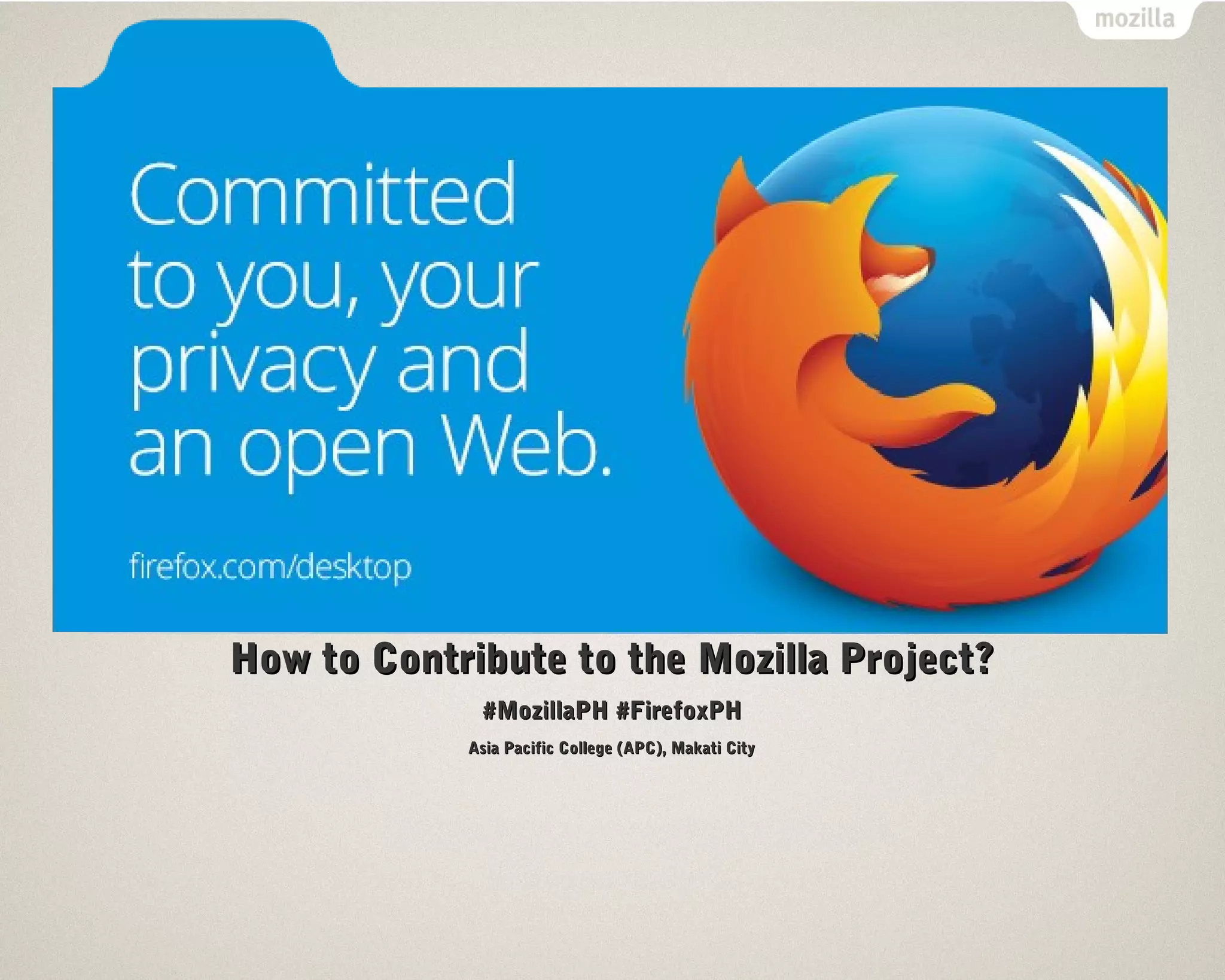 The document provides information on how to contribute to the Mozilla project. It discusses Mozilla's mission to promote openness and innovation on the web. It then lists several areas for contribution, including helping users, testing, coding, marketing, translation, web development, add-ons, design, documentation, and education. It encourages contributors of all skill levels and time commitments to get involved with Mozilla's open source work.