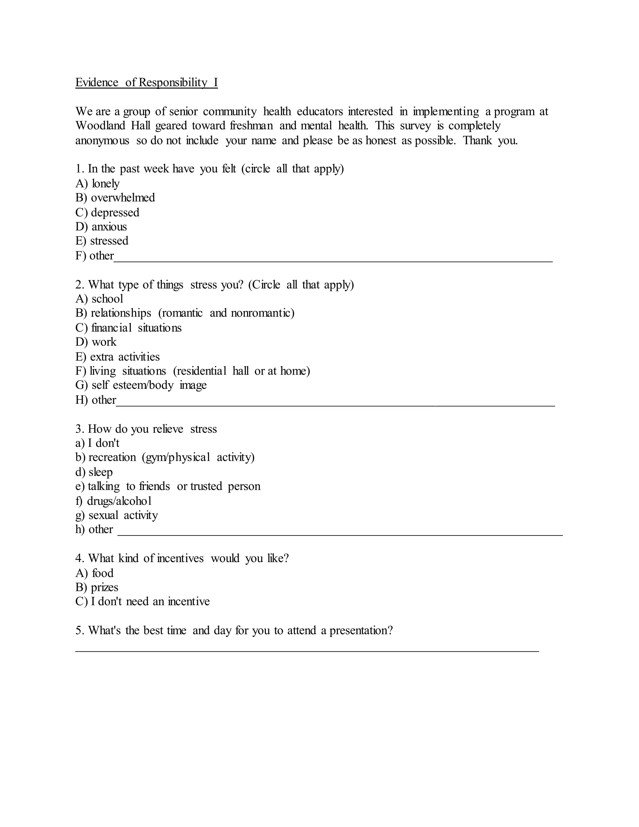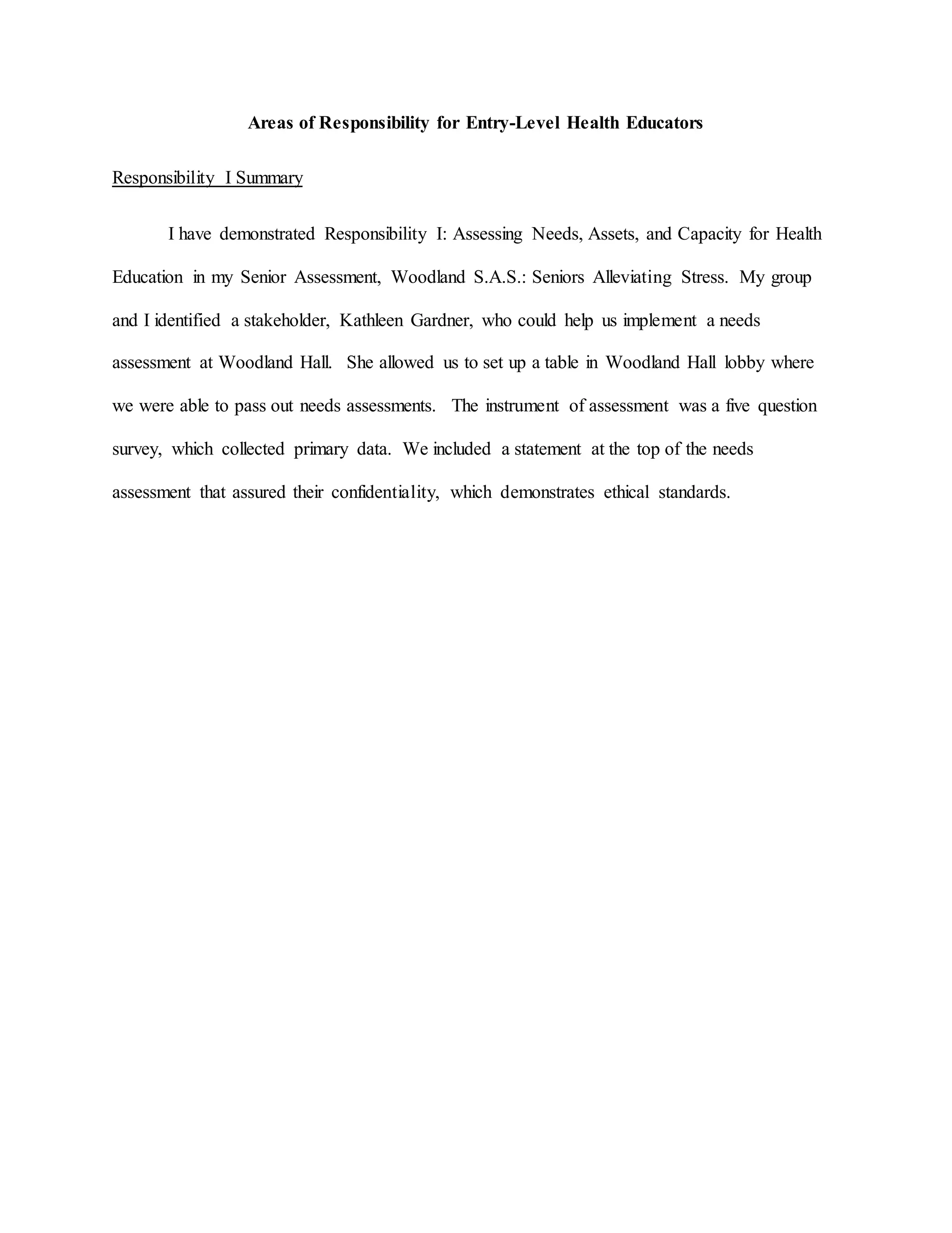 An entry-level health educator demonstrated several responsibilities in their senior assessment project. They identified the needs of freshmen residents through a survey and planned programs to address stress reduction. Programs were implemented and included yoga, discussions, and information on campus resources. Evaluations were conducted through pre- and post-tests to measure knowledge gained and change in stress levels. Partnerships were formed, a budget was managed, and health information was disseminated to the priority population.