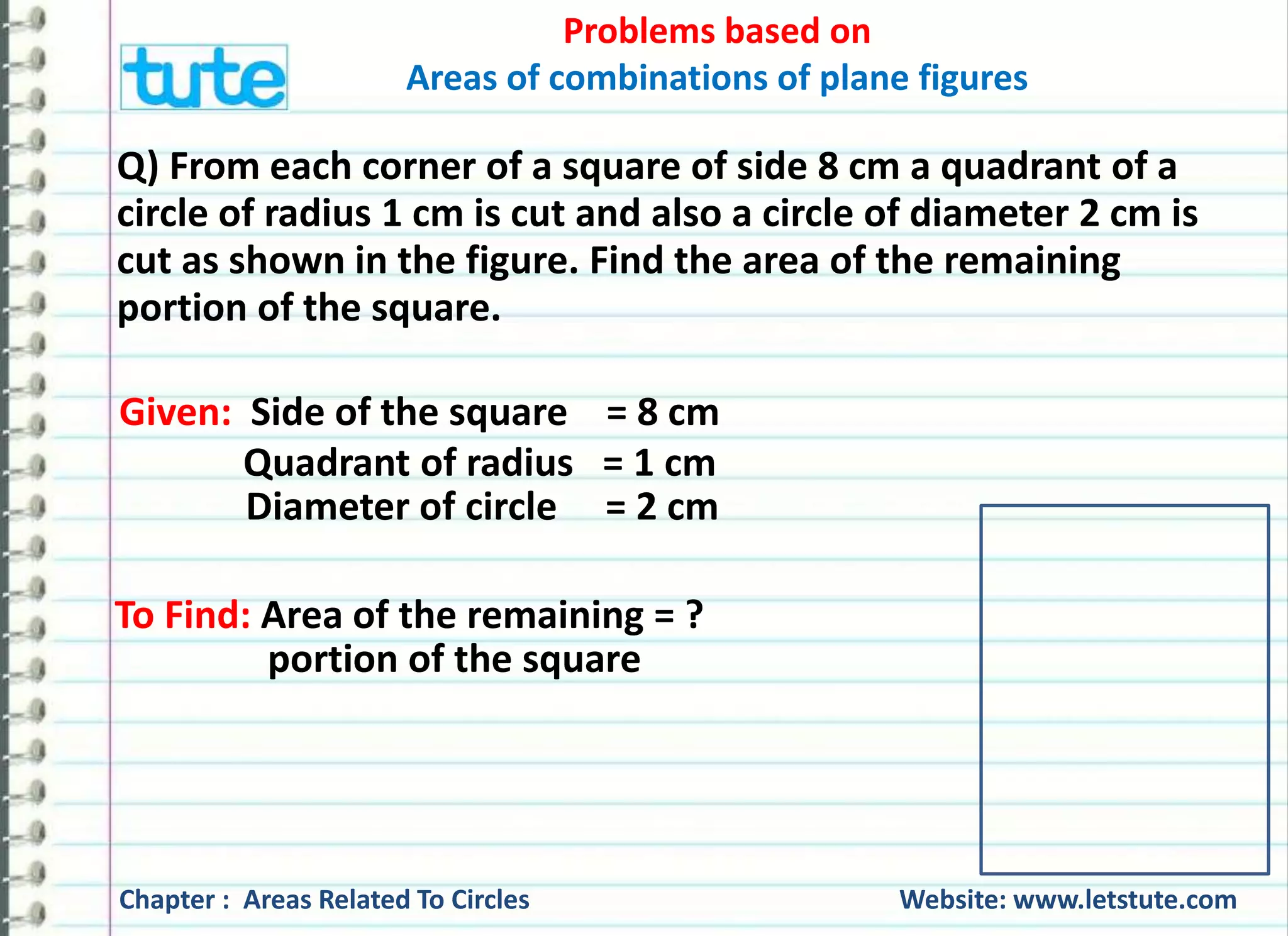 The document discusses various problems related to calculating areas and combinations of plane figures, particularly circles and squares. It provides solutions to specific problems such as finding the remaining area of a square after cutting out circles and quadrants, as well as determining the area of shaded regions in geometric figures. Additionally, it outlines the formulas used for calculating area and perimeter for different shapes.