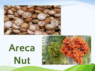The document discusses areca nut (betel nut), its cultivation, uses, and associated health risks. It highlights the geographical origins, nutritional properties, and traditional significance in India, while also detailing its chemical constituents and associated toxicities, including cancer risks. Ultimately, it emphasizes the addictive nature of areca nut and the need for regulation due to its harmful effects on health.