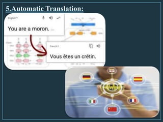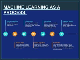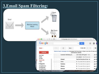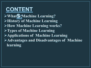 Machine learning is a form of artificial intelligence that allows computers to learn without being explicitly programmed by exploring data, identifying patterns, and improving with experience. The document outlines the history of machine learning and how it works, describing different types including supervised learning, unsupervised learning, reinforcement learning, and semi-supervised learning. It also discusses applications and advantages/disadvantages of machine learning.