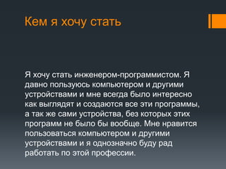 Автор документа хочет стать инженером-программистом, интересуется программированием и компьютерными технологиями. Он отмечает плюсы и минусы профессии, а также свои ожидания и амбиции в этой области. Автор уже проходит курсы по программированию и другим аспектам, чтобы лучше понять карьеру, которой хочет посвятить себя.