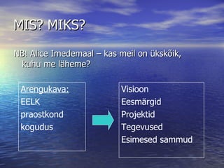 MIS? MIKS? NB!Alice Imedemaal – kas meil on ükskõik, kuhu me läheme? Arengukava: EELK praostkond kogudus Visioon Eesmärgid Projektid Tegevused Esimesed sammud