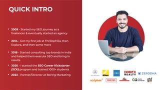 2) Research - Finding opportunities and assessing competitors using tools like Ahrefs and SEMrush to identify keyword gaps and backlink gaps. Keywords are clustered thematically.