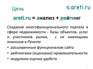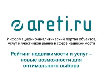 Документ описывает создание многофункционального портала в сфере недвижимости, который будет включать базы данных объектов, услуг и участников рынка, а также систему рейтингов и возможностей для самостоятельного анализа предложений пользователями. Основной целью проекта является повышение доверия пользователей к размещенной информации и предоставление инструментов для удобного сравнения и оценки объектов недвижимости. Портал будет ориентирован на продавцов, покупателей и участников рынка, включая агентства недвижимости и строительные организации.