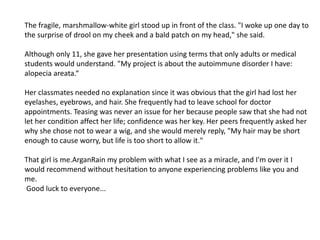 The presentation titled 'Hair Today, Gone Tomorrow' features an 11-year-old girl explaining her experience with alopecia areata, an autoimmune disorder that caused her to lose all her hair. Despite the challenges, she remains confident and refuses to wear a wig, encouraging her peers to focus on life's positivity. The girl emphasizes her resilience and hopes to inspire others facing similar struggles.