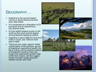Argentina is the second largest country in South America and has a population of over 44 million people. It has a diverse geography that ranges from fertile plains to mountains. While Spanish is the dominant language, the local dialect of Rioplatense Spanish is most common. The population is predominantly descended from European immigrants, and Roman Catholicism is the majority religion. Argentina gained independence from Spain in the early 19th century and experienced economic growth through exports and immigration in the late 19th century.