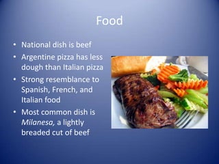Argentina's national dish is beef, especially in milanesas. Soccer is the most popular sport, and Argentina has won two World Cups. Clothing is similar to styles worn by Australian farmers, such as ponchos and pants tucked into boots. Tango originated in Buenos Aires and is Argentina's most famous musical genre. Spanish is the official language, though Italian and German are also commonly spoken. Buenos Aires is the capital and largest city, known for its landmarks in Plaza de Mayo like Casa Rosada.