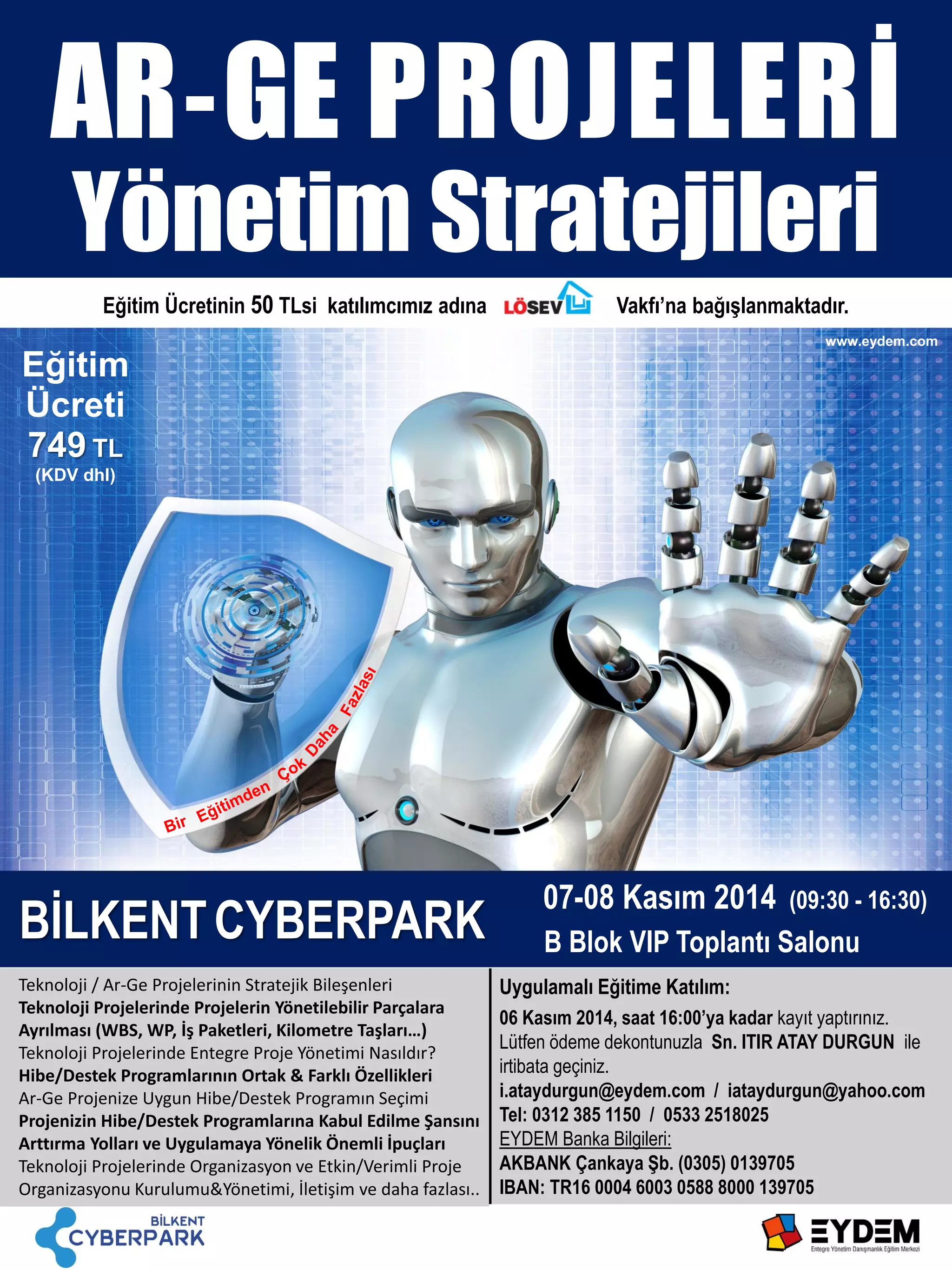 AR-GE PROJELERİ YÖNETİM STRATEJİLERİ 07-08 KASIM 2014 Cuma-Ctesi günleri 09:30 - 16:30 saatleri arasında Bilkent Cyberpark B Blok VIP Toplantı Salonu’nda Bilkent Cyberpark, ve EYDEM işbirliği ile “AR-GE PROJELERİ YÖNETİM STRATEJİLERİ” konulu uygulamalı eğitim programı düzenlenecektir. Uygulamalı Eğitim Programı Konuları: • Proje, Teknoloji ve Ar-Ge / Teknoloji Projeleri • Teknoloji Projelerinde 5 Başarısızlık Sebebi • Teknoloji Projelerinde Proje Ömür Devri Modelleri • Teknoloji / Ar-Ge Projelerinin Stratejik Bileşenleri • Teknoloji Yönetiminin Fonksiyonları • Teknoloji Edinim Yolları-Teknoloji, Firma & Yeni Ürün İlişkisi / Rekabet-Teknoloji • Teknoloji Projelerinde Projelerin Yönetilebilir Parçalara Ayrılması (WBS, WP) • Teknoloji Projelerinde Sistem-Alt Sistem-Ürün-Ara Ürün-Parça Ayrımı – Spekts) • Teknoloji Projelerinde Alt Yönetim Alanları ve Birbirleri ile Entegrasyon • Teknoloji Projelerinde Entegre Proje Yönetimi • Bir Teknoloji Projesi Ne Kadar Büyük ve Karmaşık Olabilir? • T.C. Kalkınma Planına Göre (2014-2018) Ar-Ge / Teknoloji Öngörüleri (Öncelikli Tekno. Alanları) • Destek Talep Edebileceğimiz Projelerin Özellikleri • Hibe/Destek Programlarının Ortak & Farklı Özellikleri, Uygun Programın Seçimi • Projemizin Hibe/Destek Programlarına Kabul Edilme Şansını Arttırma Yolları • Teknoloji Projelerinde Organizasyon ve Etkin/Verimli Proje Organizasyonu Kurulumu ve Yönetimi • Proje Yönetiminde Uygun & Etkin İletişim Araçları • Proje Yönetiminde Doküman ve Rapor Çeşitliliği • Global Ortamda Etkin İletişimin Önemi • Uygulamalar • Proje Tecrübe Paylaşımları Tecrübe Aktarımı ve Uygulamaları içeren Eğitim Programımıza katılım ücreti sadece 749 TL’dir. (KDV dhl) Eğitim Katılım Ücreti’nin 50 TL’si katılımcılarımız adına LOSEV Vakfı’na bağışlanmaktadır. (Bağış Sertifikalı) Eğitim sonunda eğitim katılım belgesi verilecektir. Nasıl Katılacağım?: 06 KASIM 2014 (saat 16:00) tarihine kadar kayıt yaptırmanız rica olunur. Seminere kayıt için lütfen ödeme dekontunuzla Sn. ITIR ATAY DURGUN ile irtibata geçiniz. E-posta : i.ataydurgun@eydem.com / iataydurgun@yahoo.com Tel : 0312 3851150 / 0533 2518025 EYDEM Banka Bilgileri: Akbank Çankaya Şb. (0305) 0139705 / IBAN: TR160004600305888000139705 Bilgilerinize sunarız. Saygılarımızla,