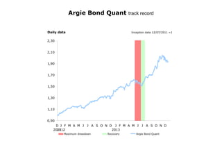 The Argie Bond Quant track record shows an annualized return of 92.72% since its inception on December 7, 2011. As of December 16, 2013, the fund has demonstrated notable performance metrics, including a Sharpe ratio of 1.98 and a maximum drawdown of -7.37%. The data reflects significant volatility and risk-adjusted returns against the IAMC bond index.