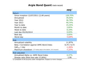 The document provides a performance overview of the Argie Bond Quant investment strategy since its inception on December 7, 2011. It includes annualized returns, risk metrics, and maximum drawdowns over various timeframes. As of May 29, 2014, the strategy has shown significant volatility and varying returns across different years.