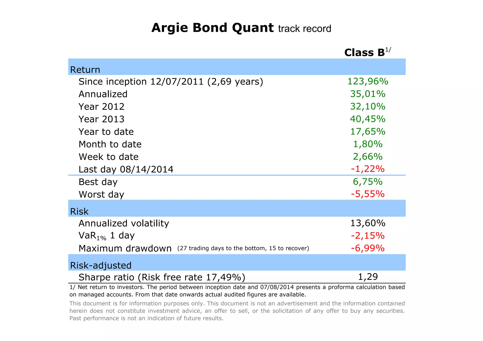 The document provides a performance summary of an investment since its inception on December 7, 2011, detailing annualized returns, risk levels, and volatility metrics up to August 14, 2014. It indicates that past performance is not indicative of future results and includes a proforma calculation period until audited figures became available. The data highlights best and worst performance days along with a risk-adjusted Sharpe ratio.