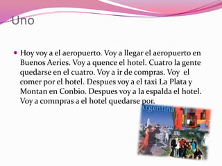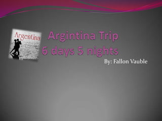 The document outlines a 6 day trip to Argentina. On day 1, the author will arrive at the Buenos Aires airport and check into a hotel. Day 2 involves going to the beach, eating at a restaurant, and seeing the play "Don't Cry For Me Argentina". Day 3 includes breakfast at the hotel and visits to Devil's Throat, Ingizau Falls, and the rainforest. Day 4 consists of breakfast at the hotel, walking the beach, lunch at McDonald's, wakeboarding, and swimming at the hotel pool. Plans for days 5 and 6 are not provided. The document lists activities and estimated costs for each day of the Argentina trip.