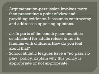 This document provides guidance on developing effective argumentation and persuasion in essays. It discusses using clear thinking and logic (logos) to make sound arguments, as well as appealing to emotion and values (pathos) to persuade readers. Key aspects covered include identifying a clear, controversial thesis; supporting it with evidence while acknowledging opposing views; using inductive or deductive reasoning; and avoiding logical fallacies. The goal is to achieve balance between logos, pathos and establishing credibility/reliability (ethos).