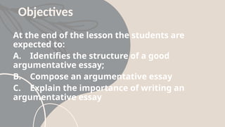 The document outlines the structure and importance of writing an argumentative essay, emphasizing its components such as the introduction, thesis statement, body paragraphs, and conclusion. It describes various types of argument claims and strategies for presenting arguments, including classical, Rogerian, and Toulmin methods. Additionally, it provides activities for students to practice writing argumentative essays on selected topics.