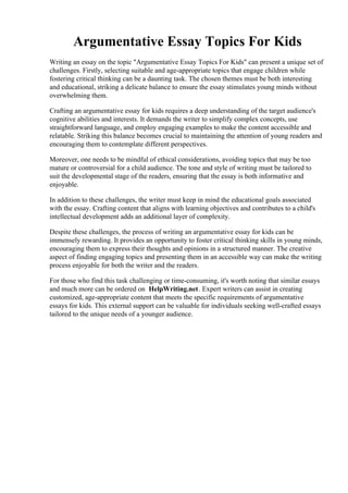 The document outlines the challenges and strategies involved in writing argumentative essays for children, emphasizing the importance of selecting age-appropriate topics that encourage critical thinking. It highlights the need for writers to simplify complex concepts and consider ethical implications while aligning with educational goals. Additionally, it notes that expert assistance can be helpful for those struggling with this task.