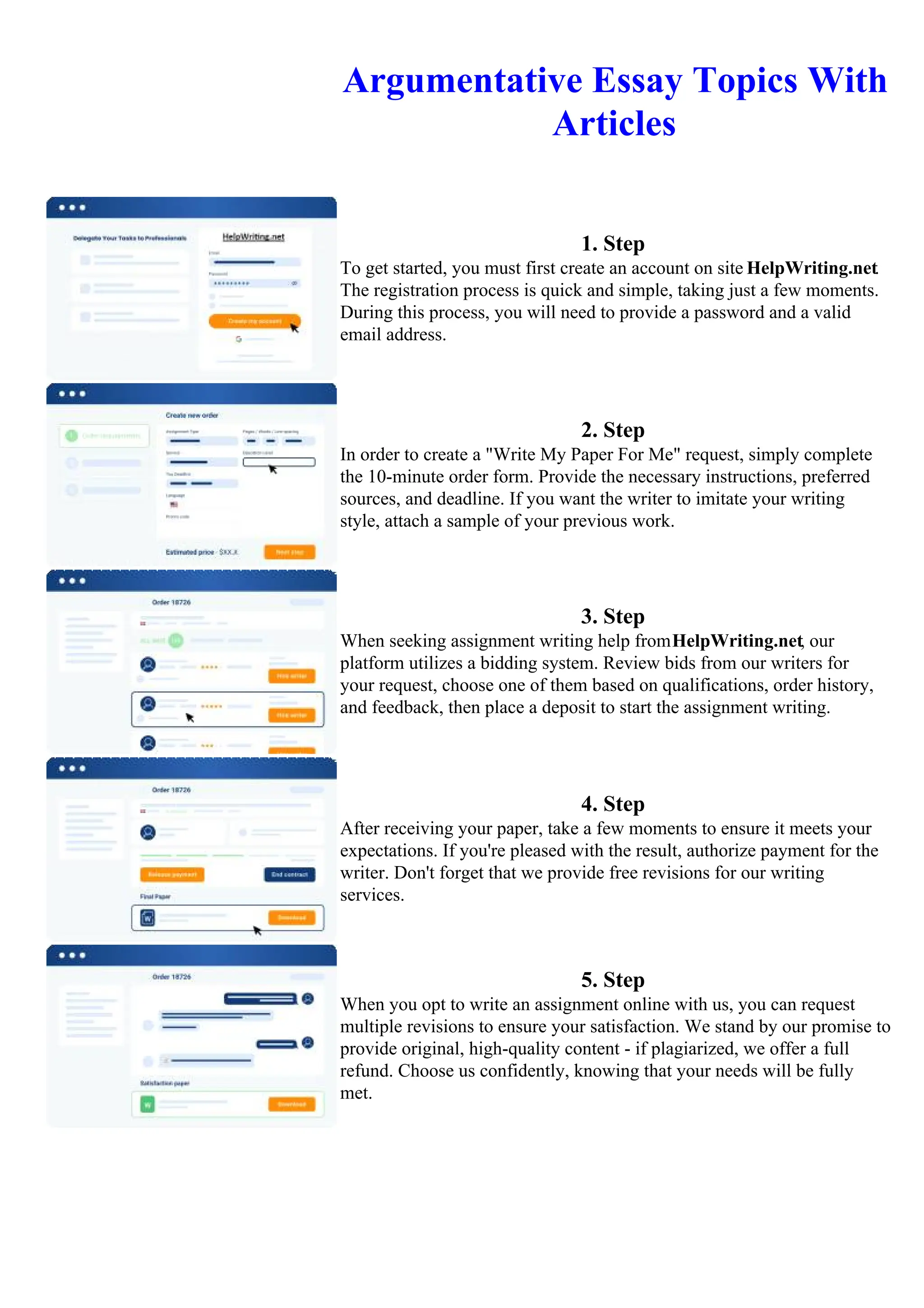 The document provides instructions for requesting writing assistance from HelpWriting.net. It outlines a 5-step process: 1) Create an account with a password and email. 2) Complete a 10-minute order form providing instructions, sources, and deadline. 3) Review bids from writers and choose one based on qualifications. 4) Review the completed paper and authorize payment if satisfied. 5) Request revisions until fully satisfied, with the option of a full refund for plagiarized work.