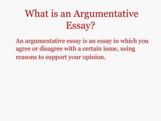 This document provides information and instructions about writing an argumentative essay. It explains that an argumentative essay requires agreeing or disagreeing with an issue using reasons to support an opinion. There are two common patterns for organizing an argumentative essay: the block pattern, which rebuts the opposing arguments first before presenting your own; and the point-by-point pattern, which alternates between presenting an opposing argument and rebutting it with your counterargument. The introduction should explain the issue, include a thesis statement stating your position, and may reference opposing viewpoints.