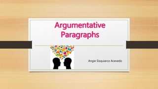 The document discusses the structure and components of an effective argument paragraph, including a topic sentence stating the claim, support sentences with evidence to back up the claim, and a concluding sentence restating the position. It provides examples of transitional words and phrases that can help structure arguments. The document also includes a sample argument paragraph arguing against smoking that follows the recommended structure.