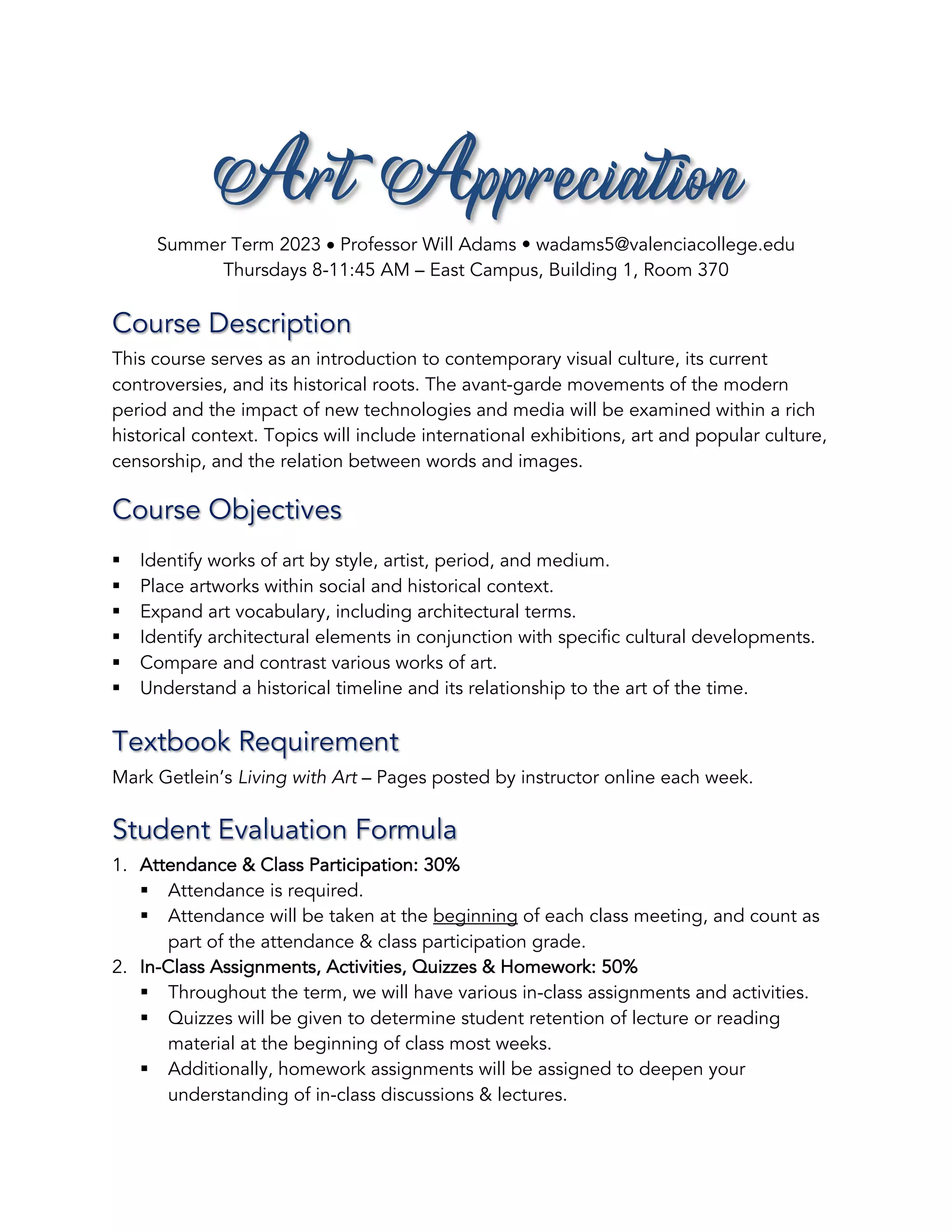 This course is an introduction to contemporary visual culture and its historical roots. It will examine modern art movements and the impact of new technologies on art. Topics include international exhibitions, art and popular culture, and the relationship between images and words. Students will learn to identify artworks by style, artist, period and medium, and place them in social and historical context. Evaluation will be based on class participation, assignments, quizzes, a final exam, and a reaction paper about a cultural event. The course meets on Thursdays and includes lectures, activities, and assignments.