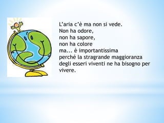 Il documento spiega l'importanza dell'aria, evidenziando la sua composizione, le sue funzioni vitali, come la respirazione e la trasmissione del suono, e il ruolo fondamentale degli alberi nella produzione di ossigeno tramite la fotosintesi. Viene inoltre analizzato l'impatto dell'inquinamento atmosferico nelle città e il bisogno di preservare le aree verdi per mantenere la qualità dell'aria. Infine, si accenna al ruolo dell'atmosfera come scudo protettivo della Terra, composta da diversi gas.