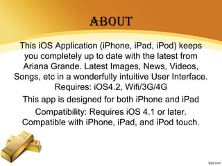 The Ariana Grande app for iOS keeps users updated with the latest images, news, videos, and songs related to the artist. Designed for iPhone, iPad, and iPod touch, it requires iOS 4.1 or later. The app highlights Ariana Grande's career, including her early roles and popular albums like 'Yours Truly' and 'My Everything.'