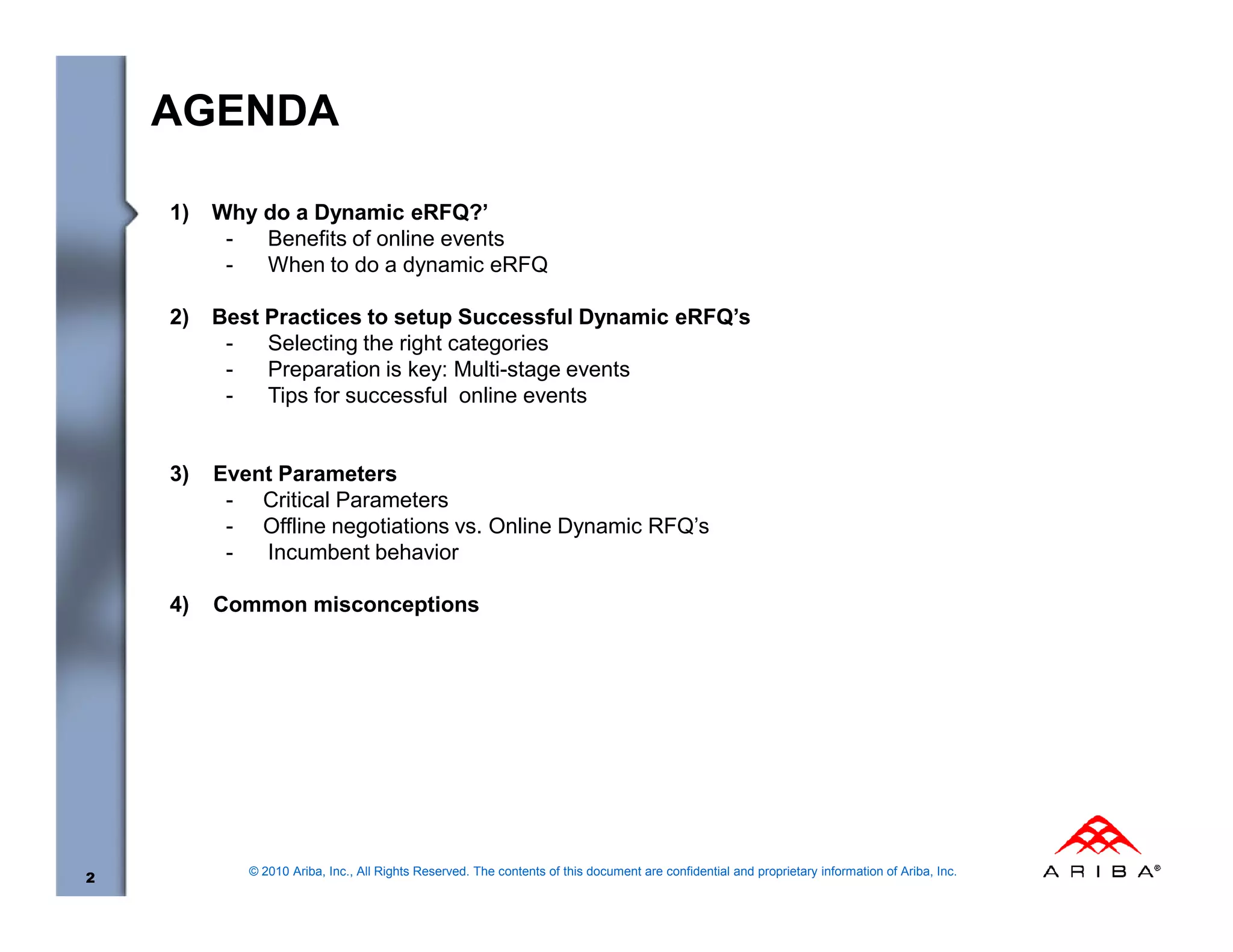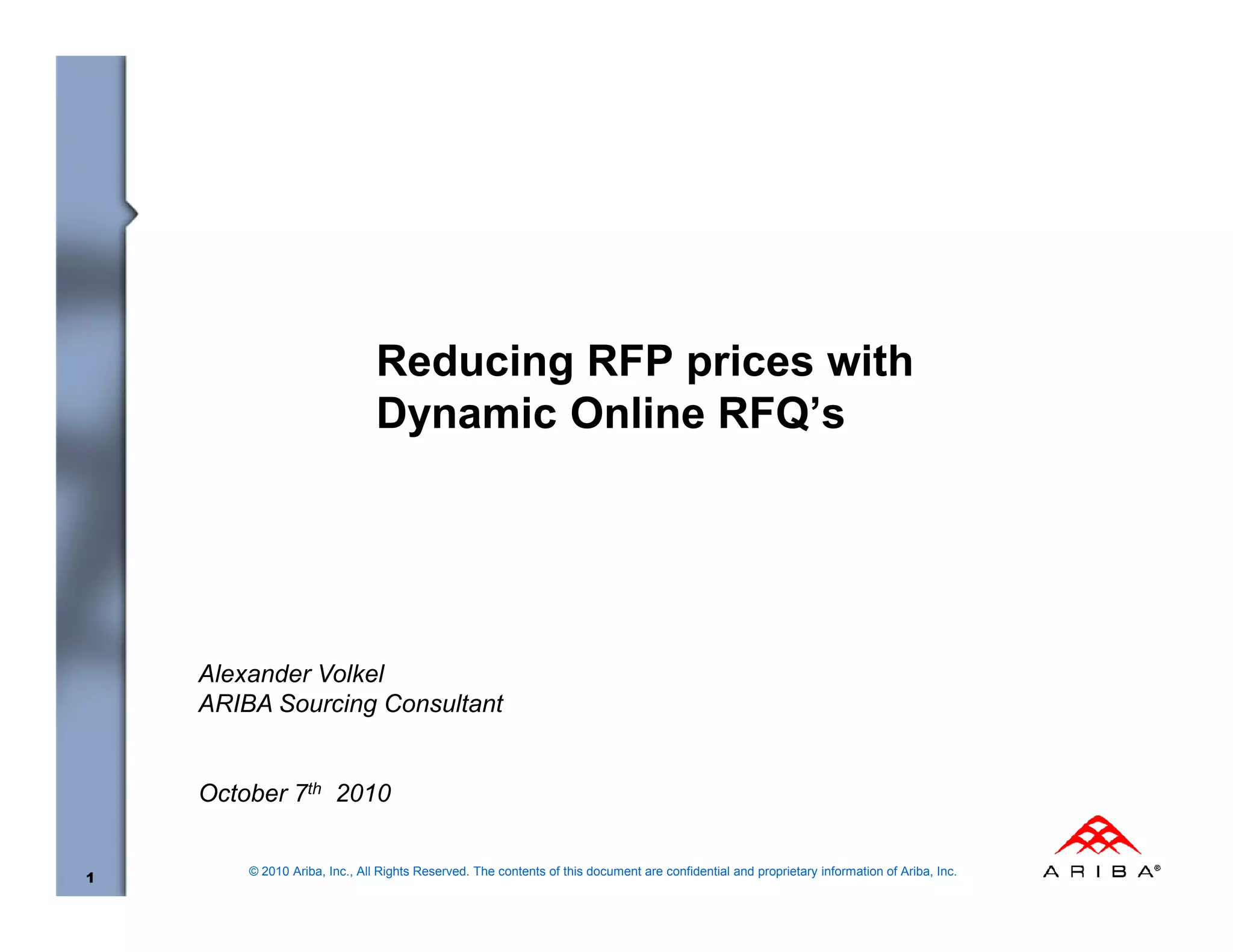 The document discusses online dynamic RFQs (requests for quotes) as a method for reducing procurement prices. It provides benefits of online dynamic RFQs such as driving incremental savings of 5-7% on average compared to traditional RFPs. The document outlines best practices for setting up successful online dynamic RFQs, including selecting the right spending categories and using multi-stage events. It also discusses parameters for online events, the role of incumbents, and debunks some common misconceptions about online dynamic RFQs. The overall purpose is to provide guidance to procurement professionals on leveraging online dynamic bidding to obtain lower prices from suppliers.