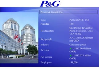This document discusses Procter & Gamble's (P&G) laundry detergent brand Ariel and its marketing strategies in India. It introduces P&G as a global consumer goods company and describes its Ariel brand portfolio in India, which includes products targeting different needs like biological, color-safe, and sensitive skin formulas. It then summarizes Ariel's marketing strategies covering its product differentiation, pricing, distribution, promotion, segmentation of target customers, and positioning against competitors with messages around superior technology, fragrances, quality, and environmental friendliness.