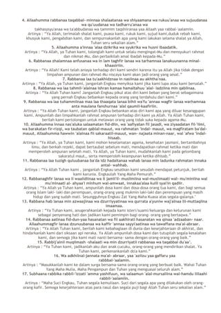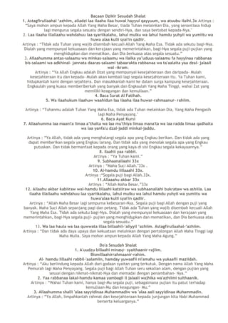 Dokumen ini berisi bacaan dzikir dan doa yang dilakukan setelah shalat, termasuk permohonan ampunan, pujian kepada Allah, dan permohonan doa untuk kesejahteraan di dunia dan akhirat. Terdapat berbagai bacaan yang mencakup kalimat pujian, pengakuan akan keesaan Tuhan, dan permohonan untuk diterima amal ibadah. Keseluruhan bacaan mencerminkan keyakinan dan tawakkal seorang hamba kepada Allah.