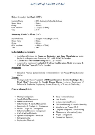 Ariful Islam's resume highlights his career objective to thrive in a challenging environment leveraging his analytical and interpersonal skills for organizational growth. He holds a BSc in Industrial & Production Engineering with several relevant work experiences, including managing production at Rangpur Foundry Limited. The resume outlines his educational qualifications, skills in various software, language proficiency, and personal information.