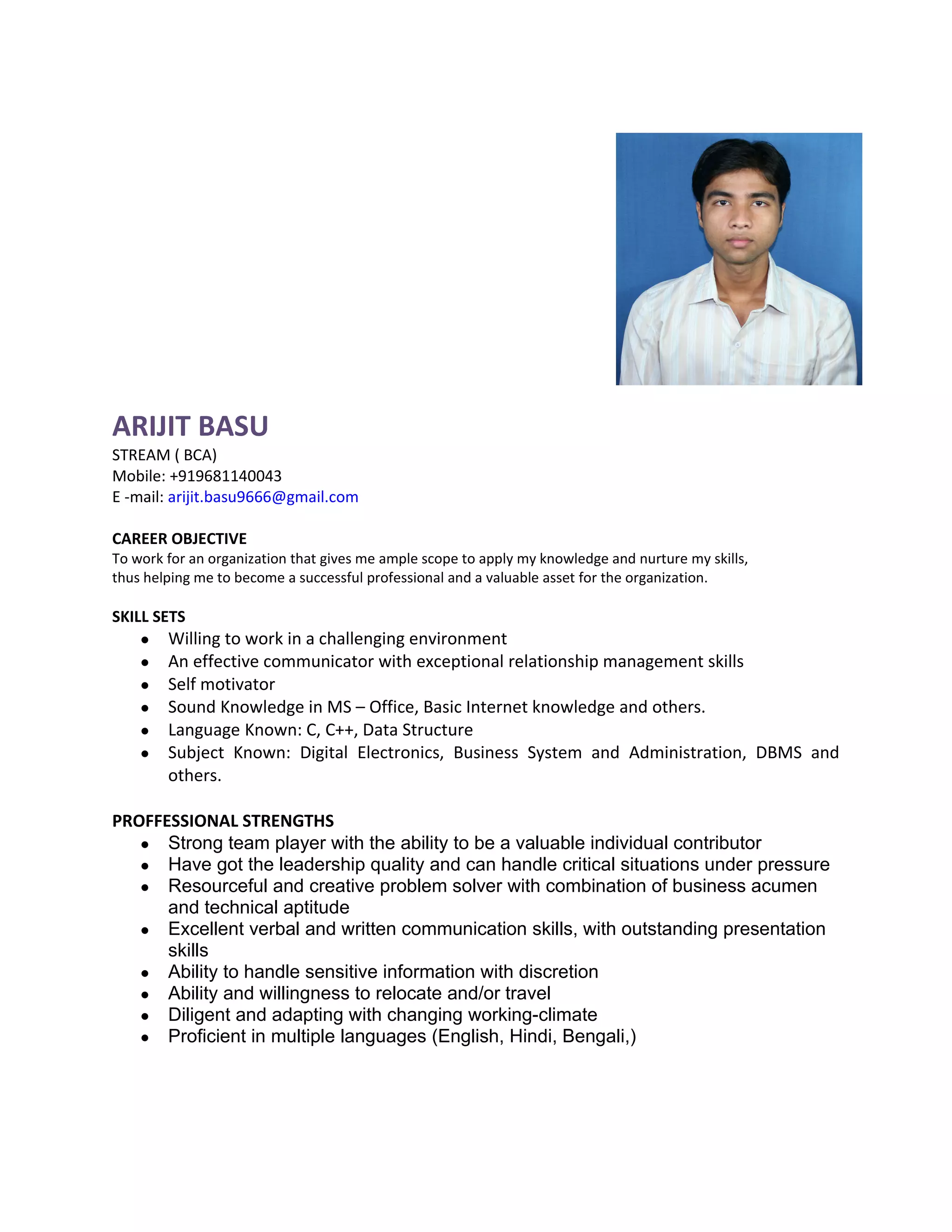 Arijit Basu is seeking a career opportunity that allows him to apply his knowledge and skills. He has a BCA and skills in C, C++, data structures, digital electronics, and MS Office. Basu has strong communication, problem solving, and leadership abilities. He has experience captaining a football team and participating in tournaments. Basu's personal details include his date of birth in 1990, current and permanent addresses in Kolkata, and father's occupation as a businessman.