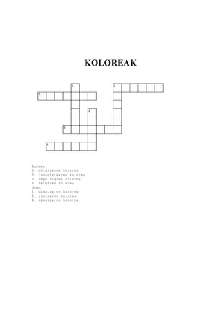 belarraren kolorea 3. txokolatearen kolorea 5. Pepa Pig-en kolorea 6. zeruaren kolorea Down 1. bihotzaren kolorea 2. ikatzaren kolorea 4. eguzkiaren kolorea