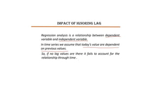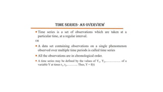 The document discusses the ARIMA model (AutoRegressive Integrated Moving Average) and its components, defined as ARIMA(p, d, q), where p, d, and q represent the autoregressive terms, degree of differencing, and moving average terms, respectively. It emphasizes the importance of using stationary time-series data for effective modeling, describing the process of differencing to achieve stationarity and outlining steps for forecasting. The document also mentions the significance of parameters p, d, and q in predicting future values based on past observations and errors.