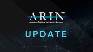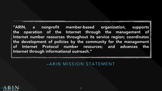 ARIN is a nonprofit organization that manages IP addresses and supports the operation of the Internet through policies developed by its community. It serves the United States, Canada, and Caribbean nations, and has over 38,000 member organizations. ARIN's focus is upholding the multi-stakeholder model, educating on IPv6 adoption, maintaining registry services, and coordinating globally. It engages communities through outreach events and actively solicits policy suggestions.