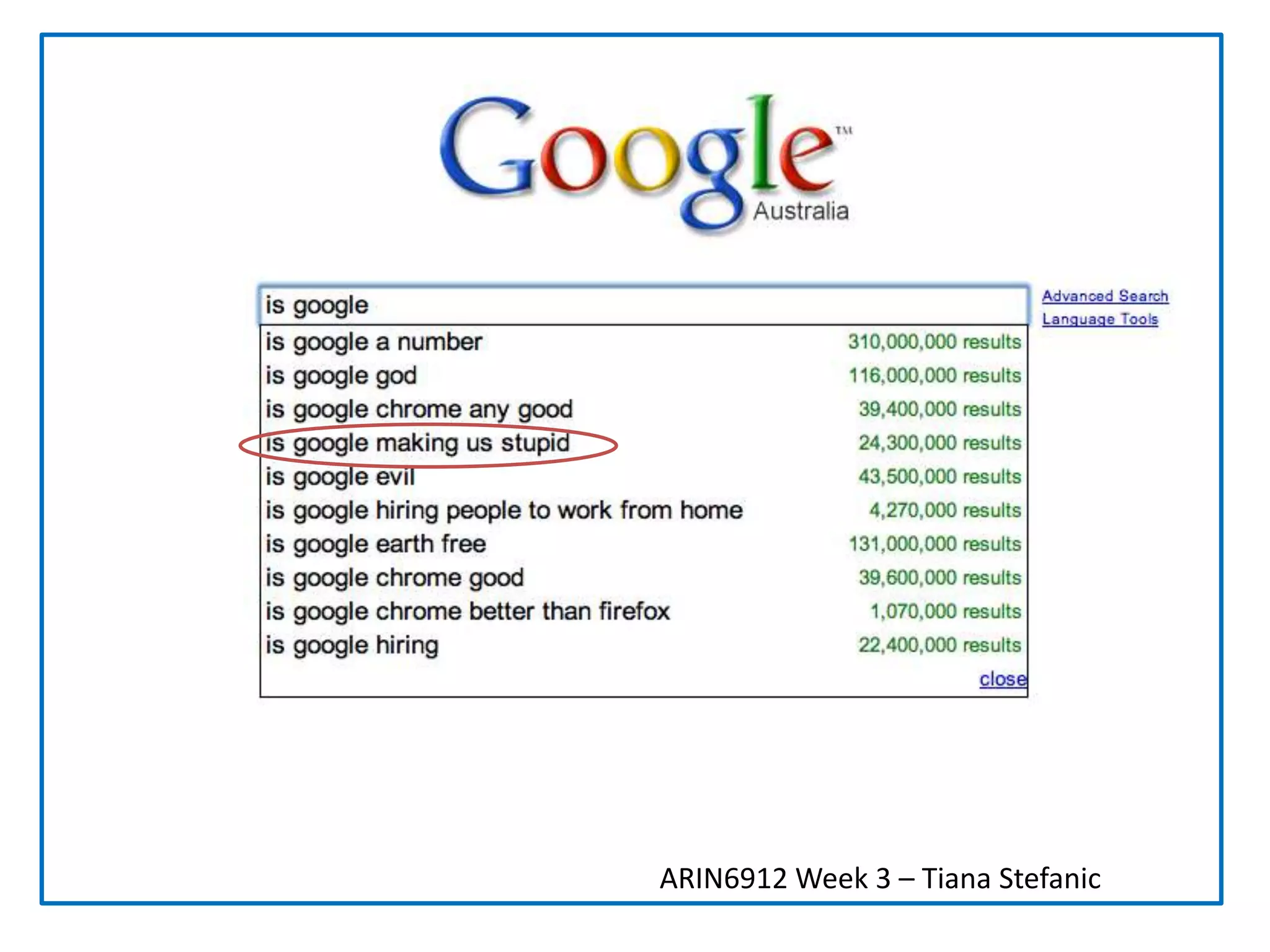 The document discusses how the internet may be changing the way our brains process information. It suggests that the internet encourages skimming of information rather than deep, focused thinking. This is due to tendencies to multitask and be distracted by hyperlinks and ads online. However, the document also notes that there are positive outcomes of internet use like benefits of multitasking and potential for creative writing. Younger generations may be adapting well to new technologies, but the long term impacts are still unknown. The document reviews several sources on both sides of the debate around the internet's effects on cognition.