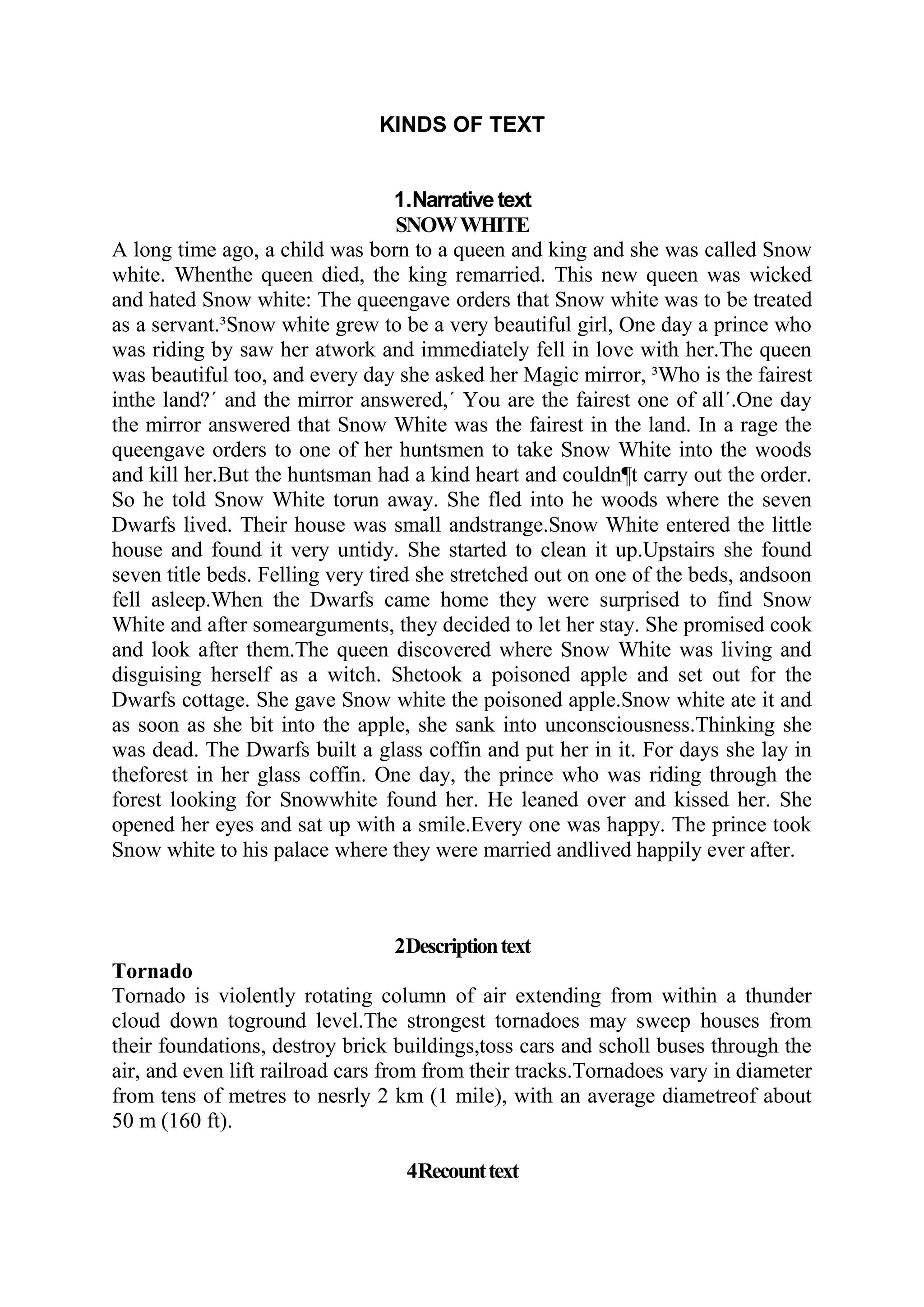 1. Narrative text is exemplified through the fairy tale of Snow White, recounting the story's key plot points.