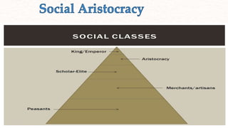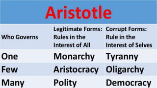 This document provides an overview of the concept of aristocracy. It begins with definitions of aristocracy as rule by the best or a small honored ruling class. It then discusses views of aristocracy from Aristotle and quotes related to it. It outlines the concept of aristocracy in Ancient Greece and Rome. It also discusses the Athenian aristocracy and presence of aristocracy in countries like Denmark, England, Spain, Nigeria and the United Kingdom. It concludes that aristocracy now broadly refers to a select few with authority in various domains like birth, wealth or intelligence.