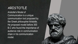 Aristotle proposed one of the earliest models of communication over 2000 years ago. In his model, communication involves a speaker, speech, occasion, audience, and effect. The speaker delivers a speech on a certain occasion to an audience, with the goal of producing a desired effect or response from the audience. Aristotle's model emphasized the importance of considering the audience and context when delivering a message.