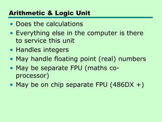 The document discusses computer arithmetic and the arithmetic logic unit (ALU). It covers integer representation using binary, two's complement representation, and floating point representation. For integers, it describes addition, subtraction, multiplication, and division. For floating point numbers, it discusses the sign-magnitude format, normalization, ranges, densities, and the IEEE 754 standard. Arithmetic operations for floating point include adding exponents and multiplying/dividing significands while handling signs, normalizing results, and rounding.