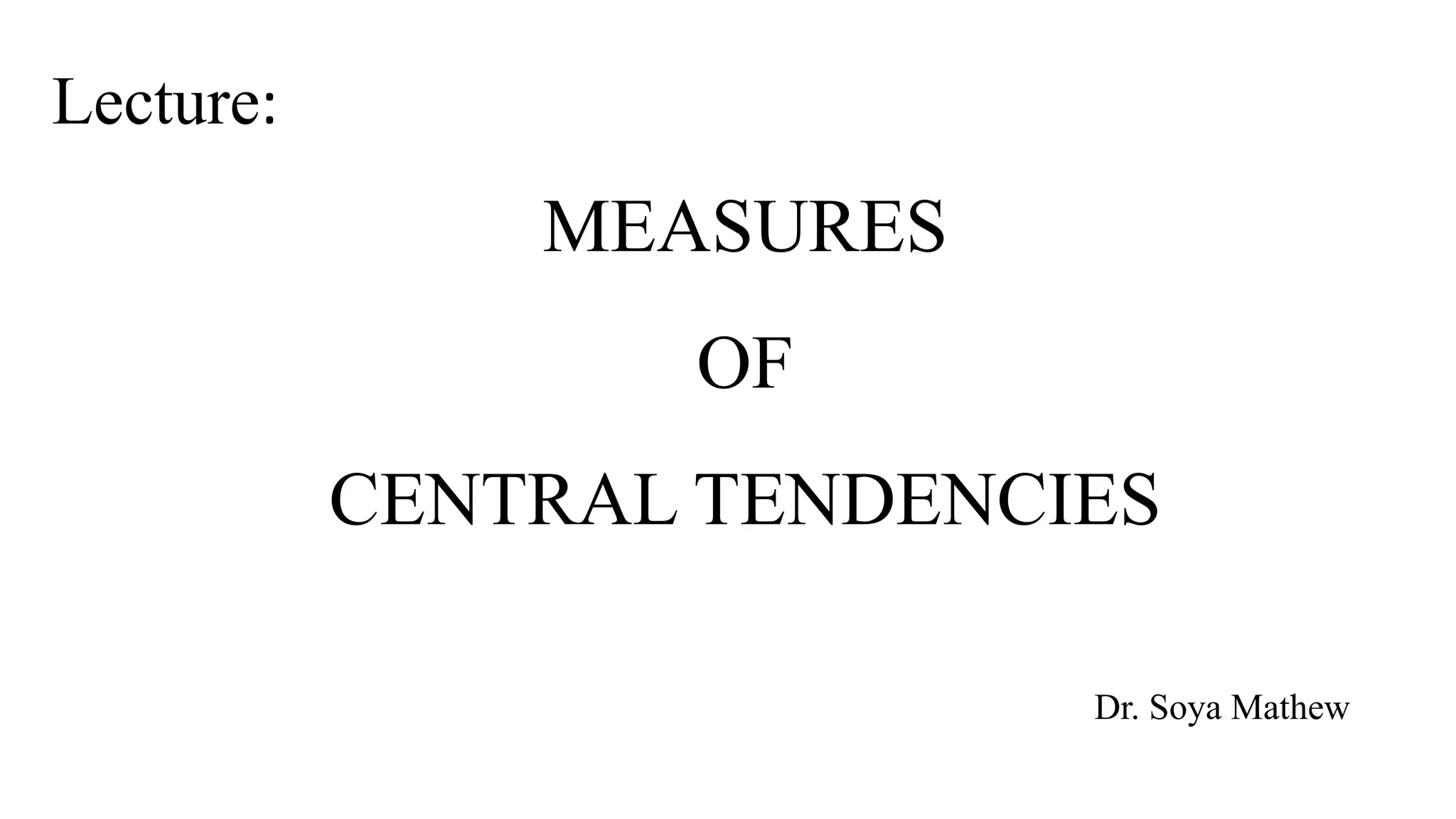 This document discusses measures of central tendency, specifically the arithmetic mean. It provides examples and step-by-step solutions for calculating the arithmetic mean of individual data sets, discrete series with frequencies, and continuous series grouped into class intervals. For continuous series, the formula uses the mid-point of each class interval. The document also includes one problem that requires solving for a missing frequency given the calculated arithmetic mean.