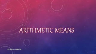 This document provides examples and explanations of arithmetic means and arithmetic sequences. It defines arithmetic means as the terms between any two non-consecutive terms of an arithmetic sequence. Example problems are given to demonstrate how to insert arithmetic means between given terms and find the common difference to determine the full arithmetic sequence. The last example asks how many numbers divisible by 8 are between 4 and 1000.